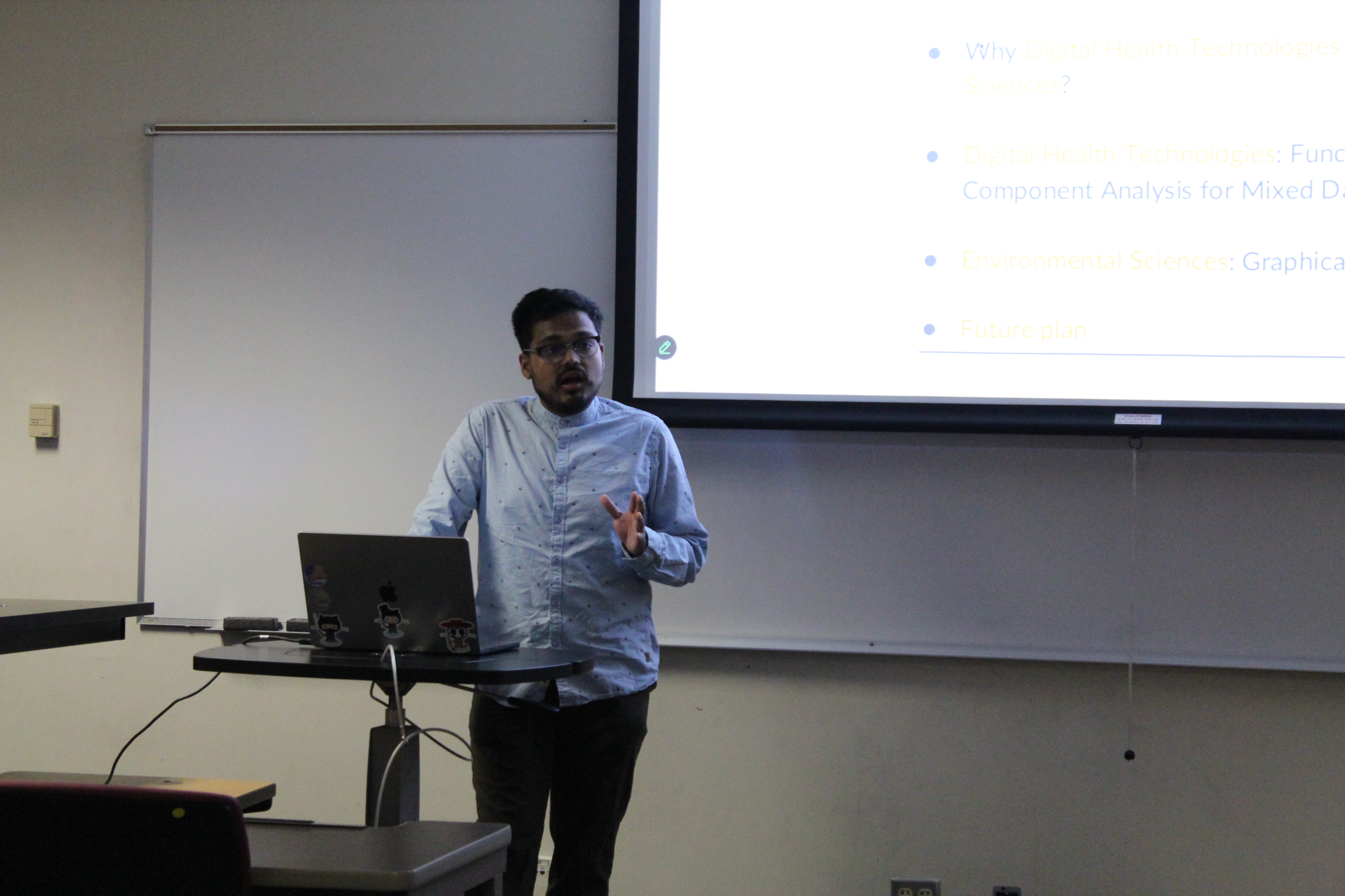 Wearable sensors, smartphones, and app-based ecological momentary assessment (EMA)—collectively referred to as digital health technologies (DHTs)—are revolutionizing how we monitor mental and physical health in real-time. At the same time, environmental sciences collect rich geospatial data to study environmental exposures affecting health outcomes. Using passively collected location data, it is possible to augment DHT data with environmental science by linking individuals’ locations to contextual environmental exposures, such as air pollution and temperature. However, analyzing these high-dimensional, multimodal longitudinal data requires statistical methods that accommodate mixed data types and dependencies. This talk presents methodological advancements addressing these challenges. I introduce a Functional Principal Component Analysis (FPCA) framework for mixed-type functional data—including continuous (e.g., physical activity), truncated (e.g., pain levels), ordinal (e.g., mood states), and binary (e.g., life events)—using a latent semiparametric Gaussian copula process to model temporal dependence. Applying this method to EMA and actigraphy data from the National Institute of Mental Health Family Study, we identify multivariate mood and physical activity phenotypes that distinguish mood disorder subtypes, including Major Depressive Disorder and Bipolar Disorder Types 1 and 2. Looking forward, I will extend these ideas to dependent functional data in family studies, individualized digital phenotyping, and methods addressing spatial confounding to assess whether physical activity mediates environmental effects on mood, leveraging large-scale datasets from the 12 sites in the Motor Activity Research Consortium for Health (mMARCH).