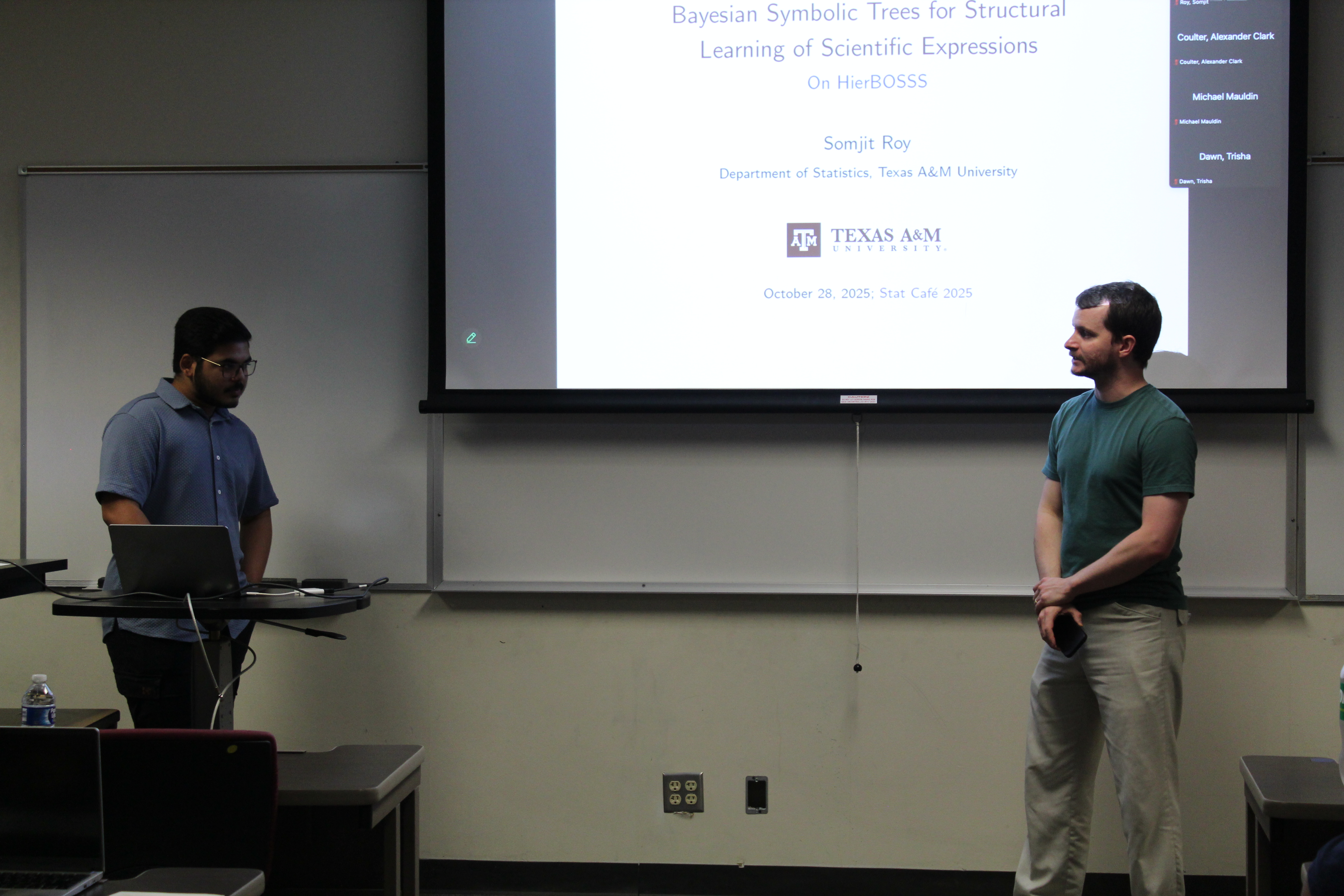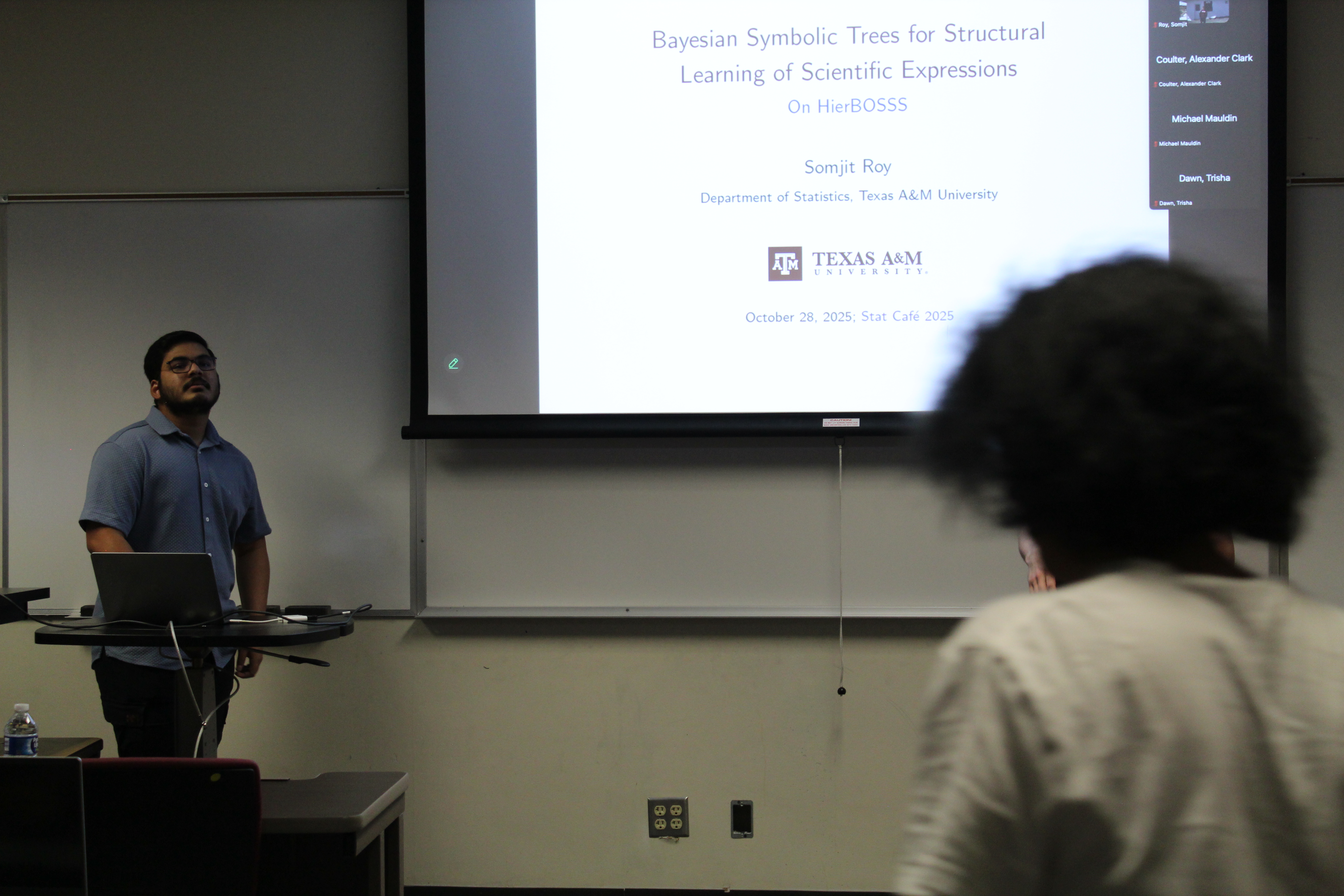 Somjit Roy is pursuing his doctoral degree in Statistics at Texas A&M University, under the supervision of Dr. Bani K. Mallick and Dr. Debdeep Pati. His research focuses on Scientific Machine Learning, Approximate Bayesian Methods, and Bayesian Optimization. He holds a B.Sc. and M.Sc. in Statistics from the University of Calcutta, India.